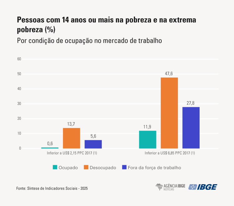 A proporção de pessoas ocupadas que estavam na pobreza foi de 11,9% (ou 12,0 milhões), enquanto 47,6% (ou 3,4 milhões) dos desocupados e 27,8% (ou 17,9 milhões) daqueles fora da força de trabalho estavam nessa condição. Cerca de 0,6% (ou 585 mil) das pessoas ocupadas foram consideradas extremamente pobres em 2024, enquanto entre os desocupados a proporção chegou a 13,7% (ou 987,2 mil) e a 5,6% (ou 3,590 milhões) entre aqueles fora da força de trabalho.