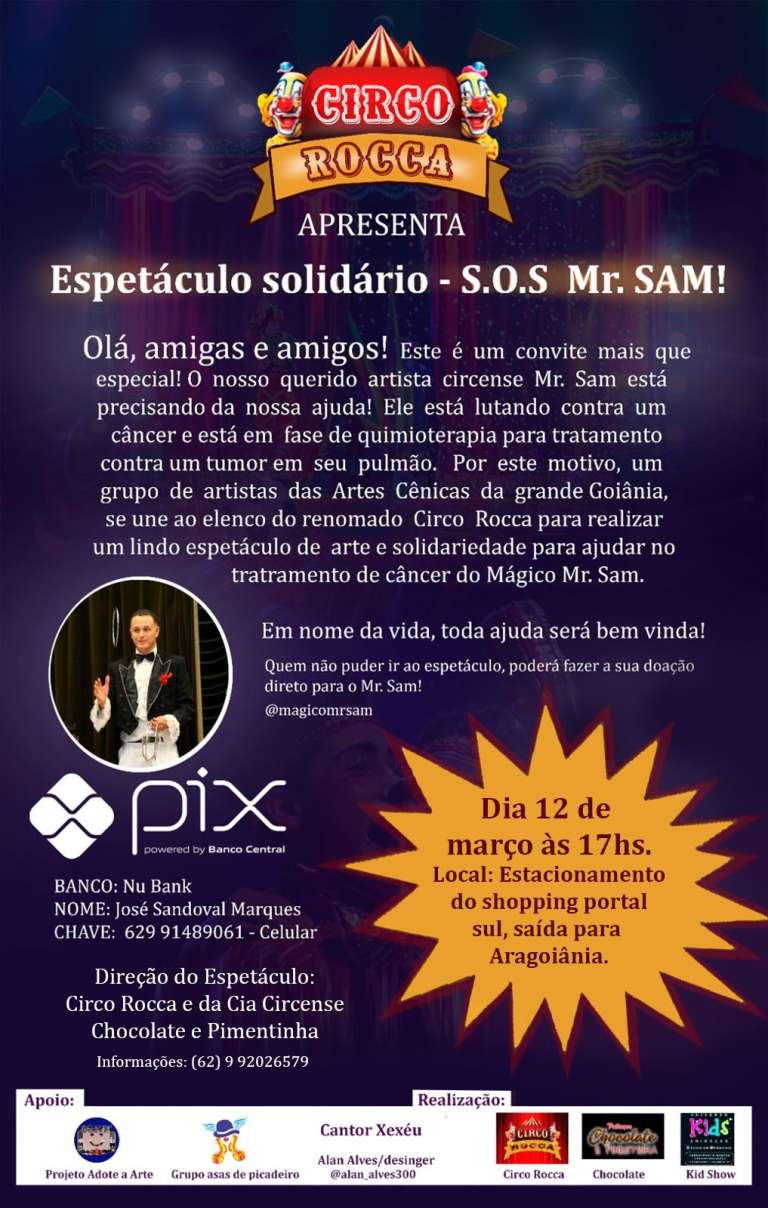 Olá, amigas e amigos! Este é um convite mais que especial! O artista circense Mr. Sam está precisando da nossa ajuda! Ele está lutando contra um câncer e está em fase de quimioterapia para tratamento contra um tumor em seu pulmão. Por este motivo, um grupo de artistas das Artes Cênicas da grande Goiânia, se une ao elenco do renomado Circo Rocca para realizar um lindo espetáculo de arte e solidariedade para ajudar no tratramento de câncer do Mágico Mr. Sam.