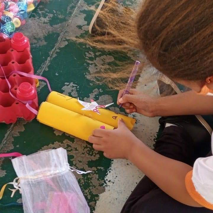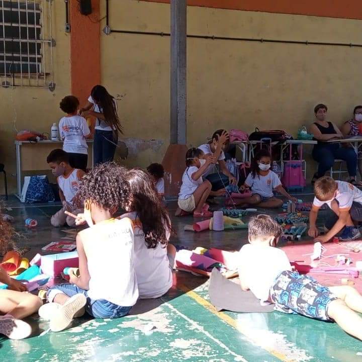 Nessa oficina participou 1 turma de crianças de 7 a 8 anos, que produziram brinquedos. Tudo feito com reaproveitando de resíduos sólidos que geramos em casa todos os dias, o que torna a brincadeira de baixo custo e nos faz refletir sobre a importância da destinação correta desses resíduos e de como podemos reduzir a sua geração.