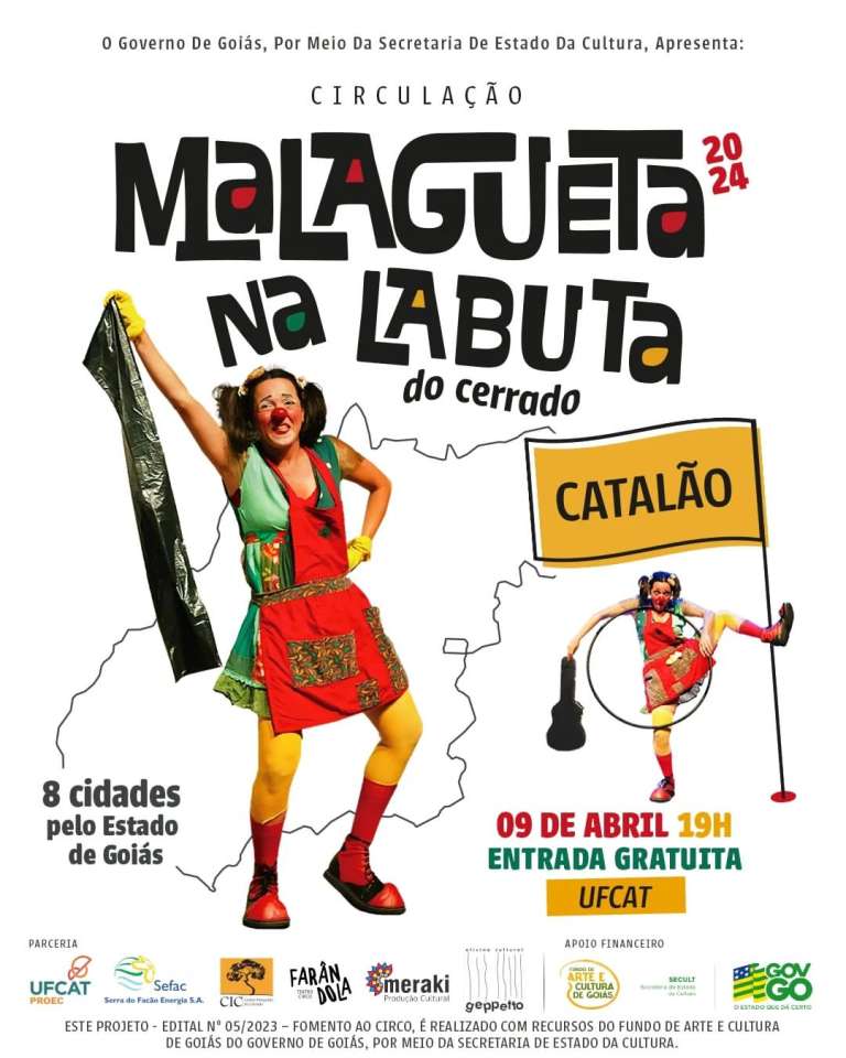 No próximo dia 09 de abril, às 19 horas, Catalão – GO receberá a derradeira apresentação da circulação dessa temporada do espetáculo “Malagueta na Labuta do Cerrado“. Com entrada franca, o evento será realizado na UFCAT – Universidade Federal de Catalão. Promovido pela Farândola Teatro-Circo, o espetáculo, protagonizado pela palhaça Malagueta, vivido pela atriz Fernanda Pimenta, é um convite irresistível para todas as idades.