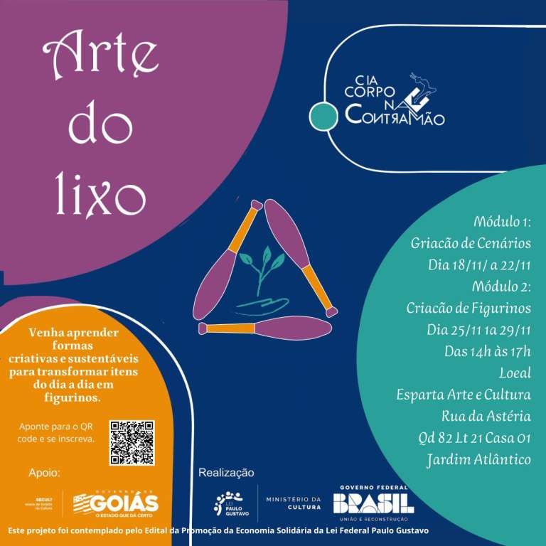 Goiânia – A Cia Corpo na Contramão, em parceria com o grupo Aptiti Cultural de Salvador-BA, promove a oficina “Arte do Lixo“, voltada para a criação de cenários e figurinos a partir de materiais recicláveis. O projeto, que busca incentivar práticas de arte sustentável, é voltado à comunidade e está inserido no contexto da economia solidária.