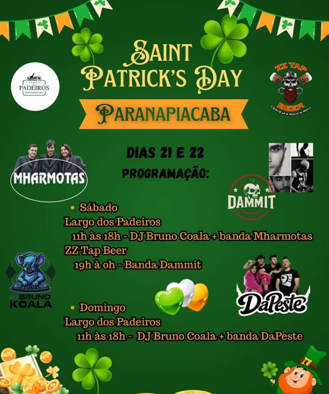 É nesse ambiente que a programação será realizada ao longo de dois dias. Das 11h às 18h, o Largo dos Padeiros concentrará as atrações abertas ao público, reunindo shows, discotecagem e intervenções temáticas associadas à celebração de origem irlandesa. A proposta inclui ainda pratos variados e o tradicional chope verde, elemento recorrente nas comemorações do St. Patrick’s Day.