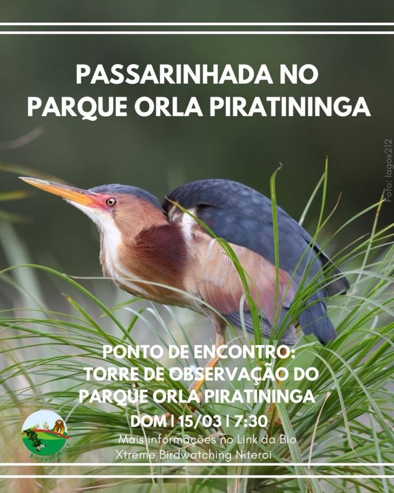O Parque Orla Piratininga, em Niterói, recebe neste domingo, 15 de março, uma edição da Passarinhada promovida pelo Xtreme Birdwatching Niterói. A atividade convida o público de todas as idades para uma caminhada de observação de aves pelos jardins filtrantes do parque, com foco na avifauna e na biodiversidade da região.