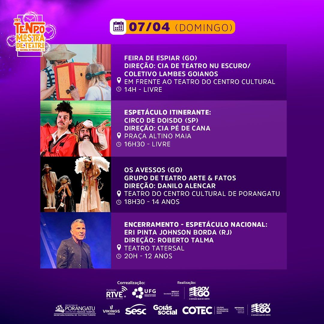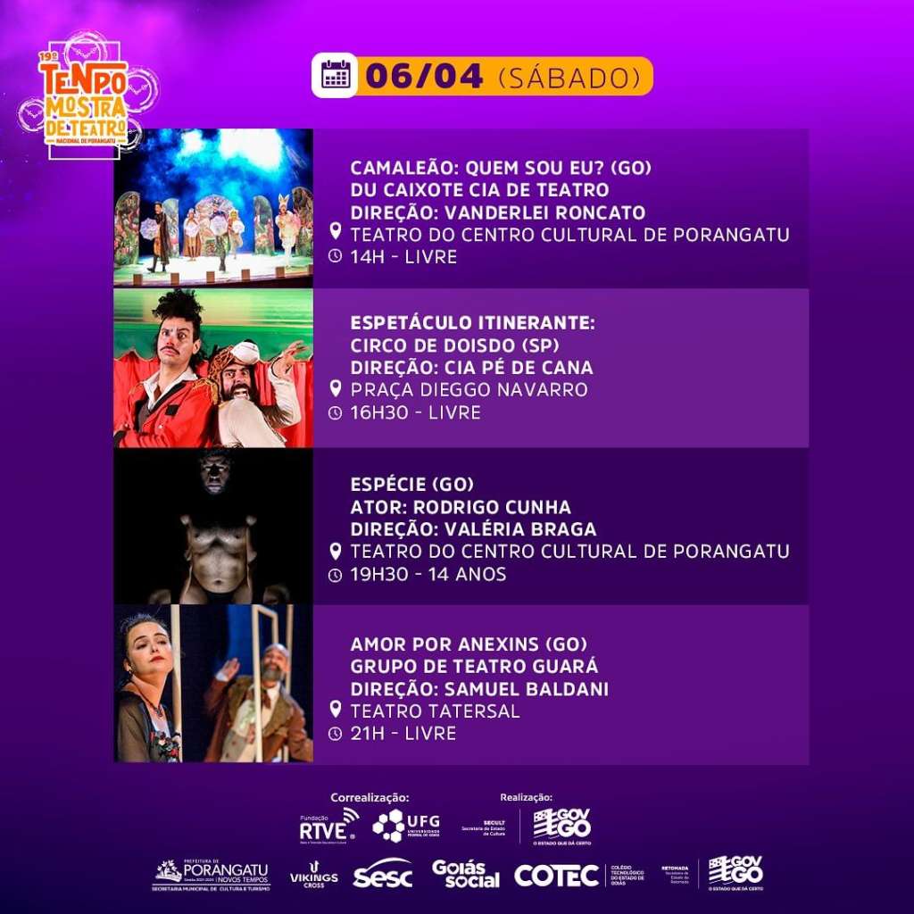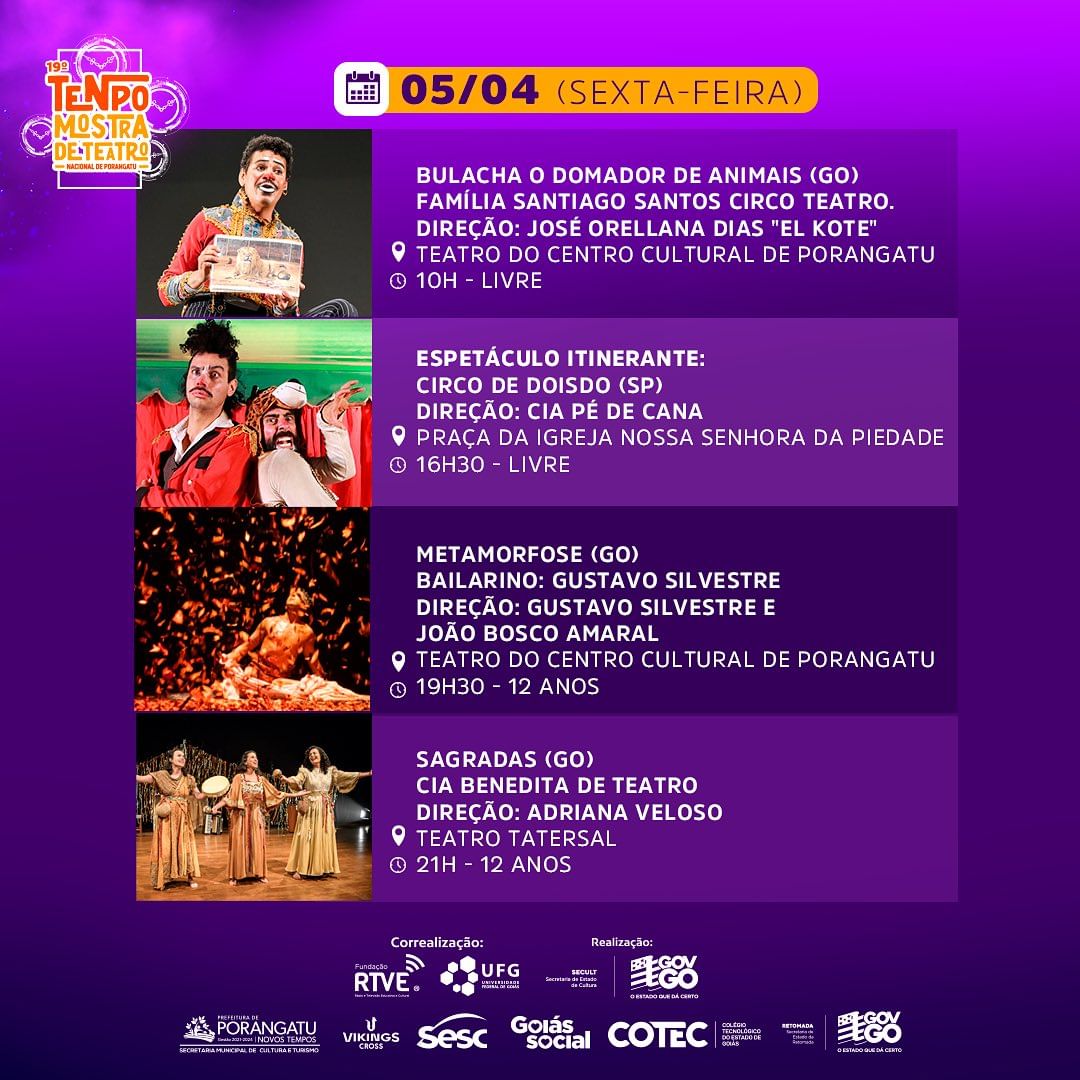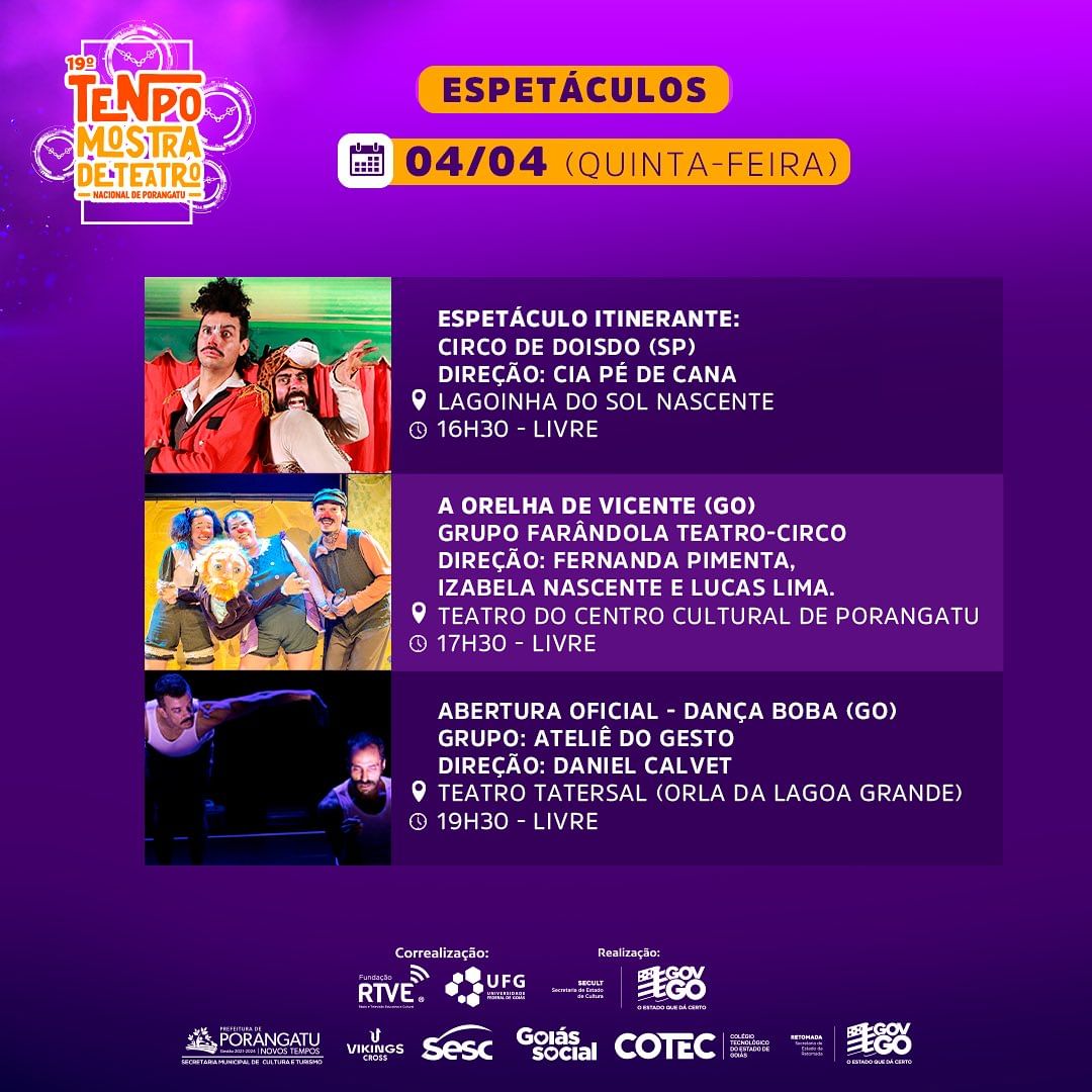 Confira a programação de espetáculos da MOSTRA NACIONAL DE TEATRO – TENPO 2024 Festivais e MostrasInteriorNotícias 25 de março de 2024 Bom Jornal Porangatu, Goiás – Programação de Espetáculos 19ª MOSTRA NACIONAL DE TEATRO – TeNpo 2024.