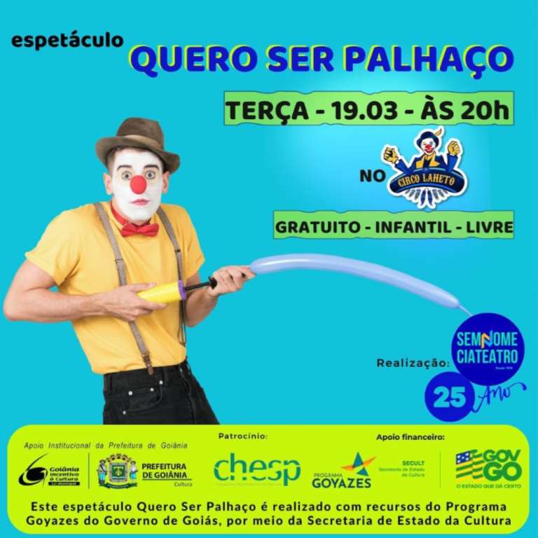 Nesta terça-feira (19) a Sem Nome Cia Teatro apresenta o espetáculo “Quero ser Palhaço“, no Circo Laheto, às 20 horas. A entrada é gratuita.